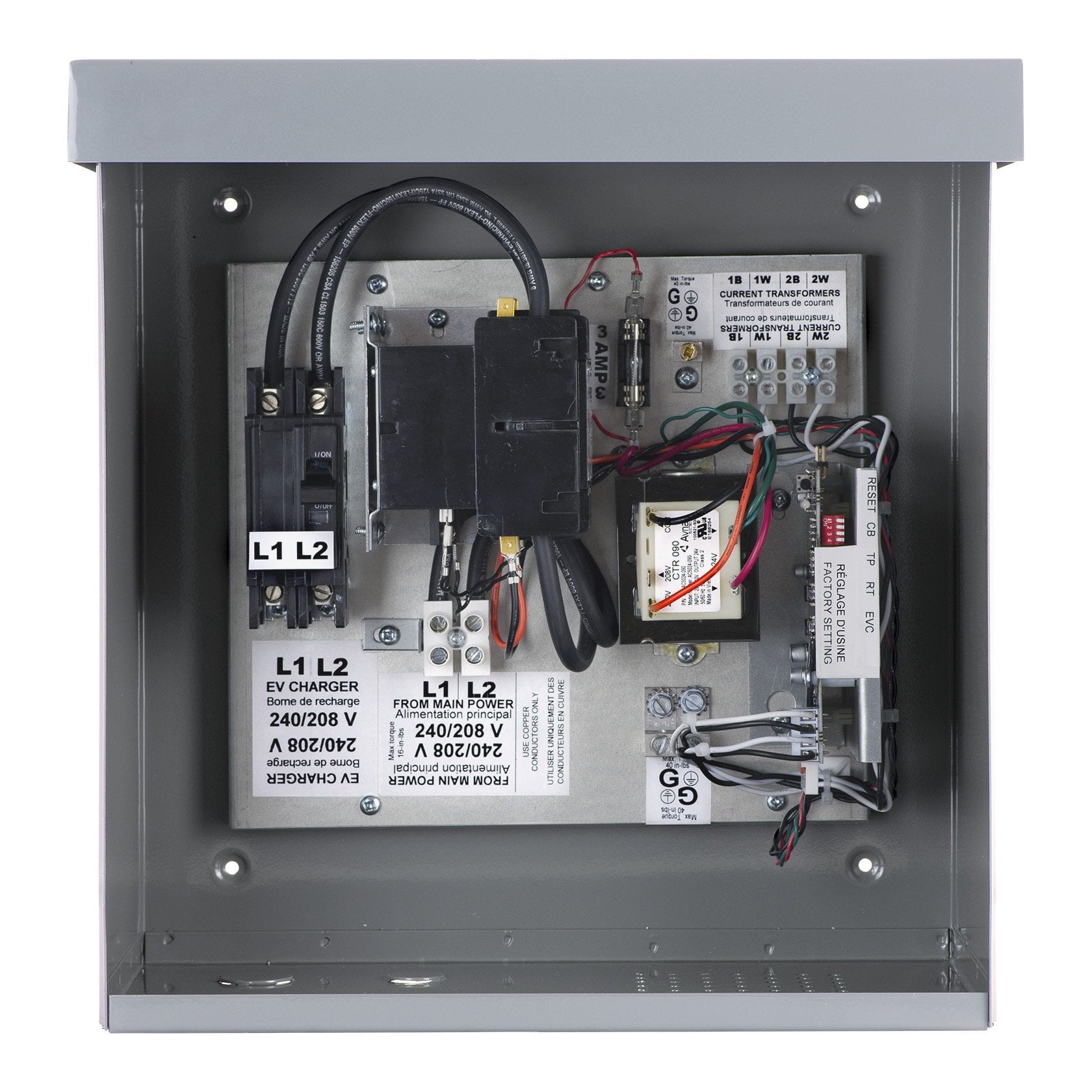 Contrôleur de charge Thermolec 240 Volts pour maison, 100A – 125A – 150A – 200A; Le DCC Maison est une composante électrique spécialement conçue pour permettre de connecter une borne de recharge de 50A à un panneau électrique qui autrement n’aurait pas la capacité suffisante pour permettre le raccordement à l’extérieur.